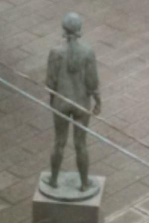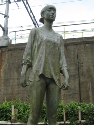 電車通勤中、線路沿いにある公園の銅像が気になった仕方ありません。電車からだと後ろ姿しか見えないのですが、どなたか前からの姿を載せていただけないでしょうか?宜しくお願いします。