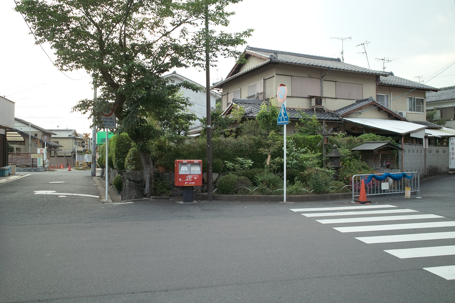 和菓子屋さんになっています。 お店の方にカメラ屋さんのことを聞いてみましたが、ご存じないようでした。 なにか、昔から変わっていないと思われる風景は無いかと辺りを見まわしてみたところ、ポストとお地蔵様がありましたので写真を撮ってみました。奥に見えるのが八幡前駅横の踏切です。
