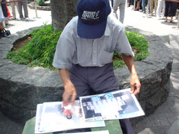 おじさんは受け取った宝くじで手元のボードをザッザッとなでて返していた。この間、お互いに無言。儀式?