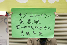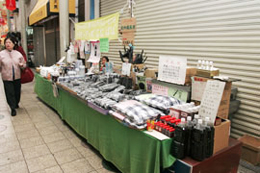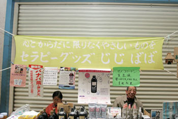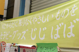 「セラピーグッズじじばば」と書かれた横断幕の下には、文字通りじじばば(失礼)が。なんとダイレクトな店名でしょうか。 じじばばの秘密を知りたいと、お話をうかがってみました。