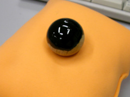 すごくぴかぴかだ。蛍光灯が写り混んでいる。木の玉とは思えない輝きをはなっている。さわってみたい。でもかぶれる。乾くまではがまんだ。がまん。