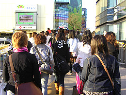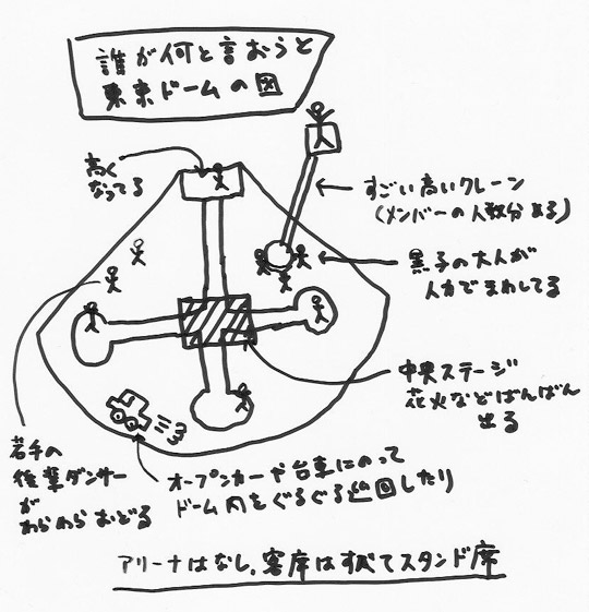 ■みんな「キャー!」って叫びながら、光るキラキラライトを振っているのですが、我を忘れて「この人、ヤバイよ!」というくらいのテンションになっている人は、私の視界には、とりあえずいらっしゃいませんでした。ほとんど皆、今どきの普通にキレイにしてる女の子ばかり。少女アイドルの男性ファンみたいに、ハッピ着たり、身体中に缶バッジを付けたり、決まった掛け声をかける人はほんといない……。実に「さめてた」。
