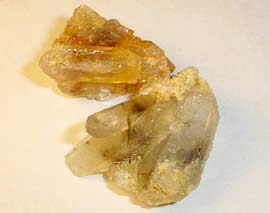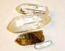 左、写真では大きく見えますが、実際は2センチほどの結晶です。 右、透明な中に黒いスジ(他の物質)の入っているものは「草入り水晶」と呼ぶそうです。