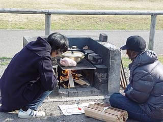借りたカマドに火を入れて、売店でマキを買って火をつける。