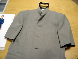 まさしく省エネスーツ。半そで、マオカラー。着てみると生地がおそろしく薄い。冗談ではなく向こうが見える。シースルーだ。