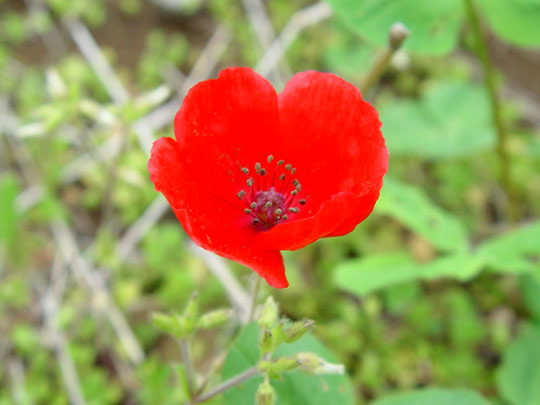 もっと歩いていくと、赤い花を見つけた。強い強い赤だ。 やさしい、あわい緑色の若葉の中で、浮かんで見える。「ちょっと、どうしてそんな色になっちゃったのよ!」と事情を聞きたい感じだ。