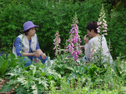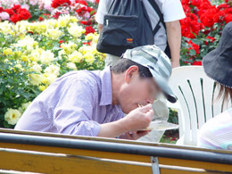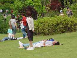 花影でおにぎり食べる人々。