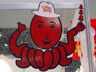 特にこれだ。タコがタコ串もって笑っている。帽子をかぶっている眉毛がある。ベトナムの水産会社のブースにて。
