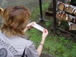 ちょっぴりがっくりして絵馬が並んでいる場所におみくじを結びつけようとする。