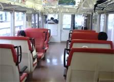 そして、この駅で乗り換えると ここから電車が 客席が対面状に設置されている いわゆる「対戦型」電車に変ったぞ!