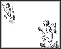 | お魚をくわえたA君を捕まえるため、愉快なB君は裸足のまま追いかけてみんなに笑われてしまった。 |