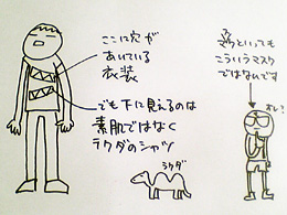 男性が着ている衣装は穴があいているデザインなのですが、穴から見える肌色は素肌ではなくラクダのシャツでした。二重になってるんですね。
