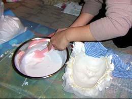 今度は顔に盛り付けたときと違い、鼻の穴などにもまんべんなく流し込みたいので、石膏はゆるめに溶く。