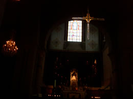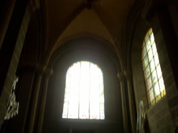小扉の奥は、巨大な礼拝堂だった。いきなりほの暗い体育館大の空間が広がる。ステンドグラスがいっぱい。ロマネスク様式というのは、カロリエンヌ王朝、ビザンチン文化、ムーア人の影響を受けた(とwebに書いてある)スタイルだそうです。この教会は、巡礼者のために、11世紀から12世紀の間に建てられたそう。日本だと平安時代から鎌倉時代にかけて、という感じですかね。ここは鎌倉だと思えばいいのか。