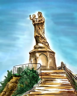 | やはり巨大岩石の上に立つ「フランスの聖母子像」。これを撮影しようとしたら、バッテリーが切れた。ミステール・・・。 |