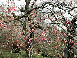 八重の桜は一重のものより開花が遅いのだけれど、このヤエベニシダレは日のよく当たる場所に生えていたせいか、幾つか花が咲いていました。