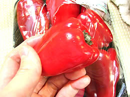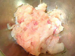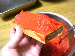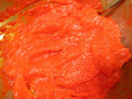 | 色を付けてみたくなって、赤ピーマンをフードプロセッサーにかけて、混ぜてみることにしました。 |