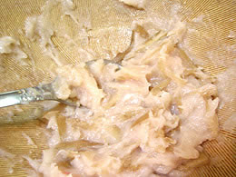 頭を落とし、腹をさいて、三枚におろして、スプーンで身だけをすくって処理します。