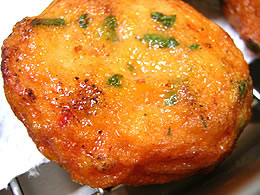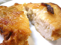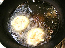 | 残ったタネは油で揚げることにします。シソを混ぜて色どり良く。 |