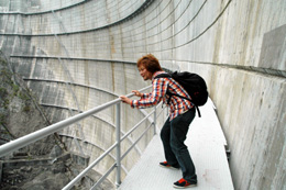 ダムの壁面に立つ