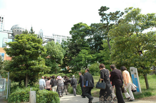 ちょっと低めの小さな木にチャレンジしていると、脇の小道を水上バス(お台場海浜公園に停留所があるのだ)から降りてきた観光の団体さんが通りかかった。