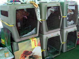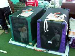 パドックの中でも、いまやいろいろな犬運搬用品があることに驚かされた。