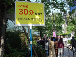 ここでは特に1番窓口で当たりがよく出るらしく、毎回行列になる。本当は私もこの行列にならんで買う予定だったのだが、写真1を見ていただきたい。30分待ちというじゃないか。そのときあまりに空腹だった私は、隣の2番売場でサクッと購入、マクドナルドへ向かってしまった。