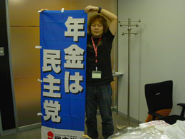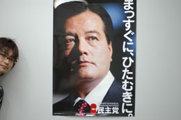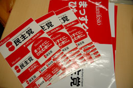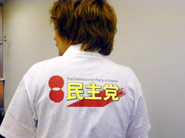 | 上から自民党のサンバイザー、民主党のTシャツ、共産党のマウスパッド。ノンポリ男ここに現る。 |