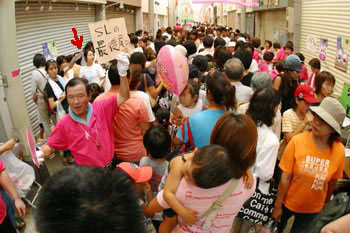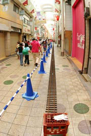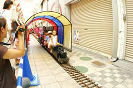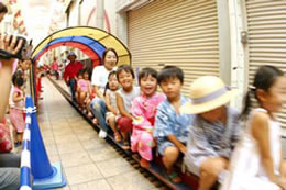 なんと、ミニSLに並ぶ人の列は、開始30分前から始まり、15分前には、すでに3重に折り返しています。列に並ぶお母さんと子供。通りを歩く人々。この人口密度、活気、熱気。これぞ駒川まつりです。