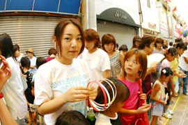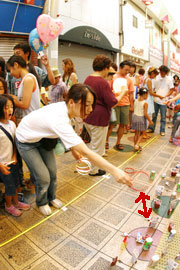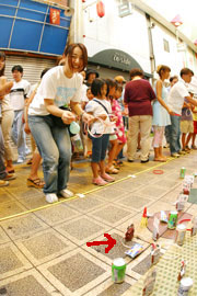 あれこれまつりを堪能した後、なにげなく輪投げの場所まで戻ってきたところ、異変に気付きました。景品が一歩前に出ているではありませんか。