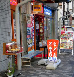 駅を南口から出てみる。夕暮れ時、そんなに簡単にうどん屋が見つかるだろうか、とちょっと心配になったがすぐにうどん屋があり、ぼっかけうどん発見。