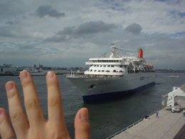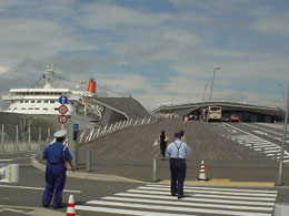 最後は港。客室数184室から296室の巨大客船が出入りしていて、中には中国やグアム、ハワイに行く船がつくこともあるという横浜港大さん橋国際客船ターミナルにやってきた。