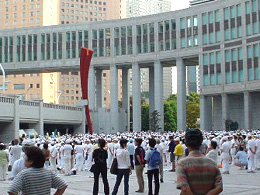 6時前に新宿駅に着くと、まだどの店も開いていない地下街を、上下そして帽子まで真っ白の一団が通っていく。上野にいたラジオ体操連盟の皆さんと同じ格好。間違いない、同志だ。