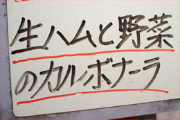 「生ハムと野菜のカルボナーラ……、ナでしょ?」 「だから、きはむとやさいのカルボナーラ」 「きはむ?」 「ええ。えへへへへ」