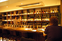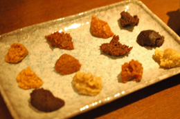 12種類のおみそがカウンターに並んでいる。その後ろには120種類(!)の黒糖焼酎。ここではお通しで3種類のなめ味噌を出している。