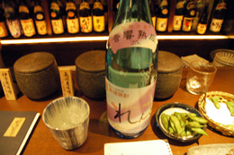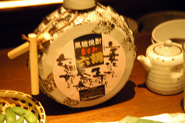 また焼酎おかわり。3杯目は僕らのイメージで焼酎を選んでもらうことに。その結果、林が40度の「六調」、住さんは25度の「れんと」。六調は太鼓の形のボトルだ。それが僕のイメージ。