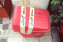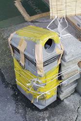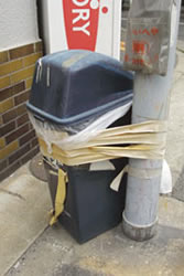 | ガムテープでフタを固定して、本体は黄色のビニールテープで補強。そして、となりのブロックにひもで巻き付けてある。非常に厳重な警戒ぶり。 |