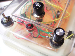 右のツマミが調整、左が音量。真ん中にスイッチ、そしてスイッチランプ。
