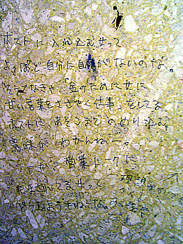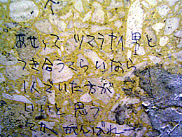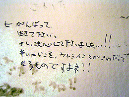 「……これ、なんて書いてあるのか読めないのですが。『魔太郎が来る!』みたいな怖さがありますね。コノウラミ…、のような」 「……ええと、『ゴキブリ コロス イイホウホウ』……あとは読めません」 「え、ゴキブリ!?」 「トイレにいますしね、ゴキブリ。 こういうの字のコは、ゴシックロリータの人かもしれませんね」 「なんで?」 「んー、カタカナ文化ってあるんですよ。自分の名前を、カタカナで書いちゃうようなのって、サブカルの好きな人の感覚といいますか……」 「あ、あるかもしんないですね」