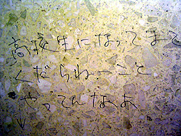 「これ、女性の落書きなんでしょうか。男性?」 「いや、筆跡にしても名前にしても、女性ですよ」 「どちらにしても、学生って名前の前に必ずクラス名を反射的に書いてしまいますね」 「私、自分が何年何組だったかとか、一切覚えてないですよ」 「まー卒業しちゃうとねえ。 学生からメールをもらうことがあるんですが、名前の前にクラス名が入っていて『で、何?』と思います」 「それはあれですよ、林さんのメールに『コンテンツ部 林』って書いてあって、それ何? って思うようなもんですよ」 「………」