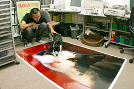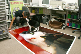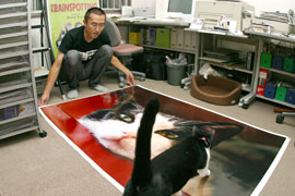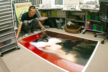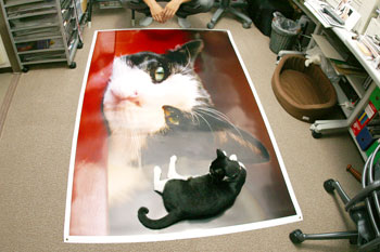 巨大プリントした猫の写真は、デジタル一眼のキヤノンD60で撮影しました。600万画素。室内(この部屋)で、ノンストロボで撮ったものです。