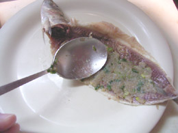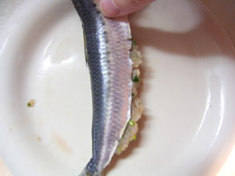 詰めていくうちにふと思ったが、この詰め物、何のことはない、いわゆる「いわしハンバーグ」だ。「骨のない魚」とは、「いわしのいわしハンバーグ詰め」だ。