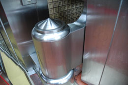 いよいよ金庫の内部まであと少し。入り口の大きな扉に驚く僕。これ、どういう状態かわかります? 今、僕の目の前にあるでかい固まりはちょうど扉の部分です。閉めるときはちょうどこれが左側の入り口の中に吸い込まれていくわけです。もうこれだけおおきいとなんだかよくわかりませんね。どんなものでもおおきくなりすぎると意味がわからなくなるようです。 ちなみにこれはアメリカ製です。日本で一番重要な金庫はアメリカ製の強固な扉に守られていたというのは何かの因果を感じずにはいれません。