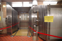 僕らが最初に見たのは、長い長い廊下でした。ここは現金を運ぶ通路だったようです。昔は大量の現金を手で運べないためトロッコで運んでいたらしく、中央にある少し色の違う部分はトロッコのレールの名残のようです。ここに何度も現金を乗せたトロッコが往来したと思うと何か感慨深いものがありますね。タイルがなんともいえない風情です。ドラクエみたいに、いきなり現金があるのではなく、本当の宝は奥にあるのです。