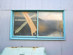 大胆に割れています。左の窓はがっつりと貼ってありますが、右側の窓は割れたまま放置。なんでしょう、この欠落感は。