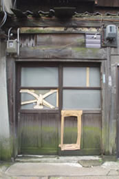 | 大きなウインドウを板で補修していると思われます。一生懸命貼った感じが出ている。 |