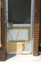 | 戸の補修。ガラスはペケ型に貼ってある。 |