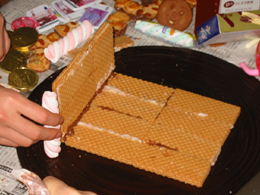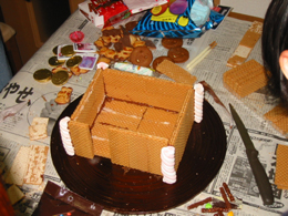 チョコレートは強力で、とてもしっかり接合することができました。これで基礎建築は完成。なんだかまだまだ心許ないですが、どうなることか見守ってみることにしましょう。ちなみに1カ所ウエハースが空いている部分は、ドアを後から接合するためです。