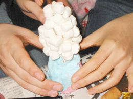 さて、屋根も無事にとりつけ、皆で飾り付けの作業に突入。最後にフロストシュガーを全体にまぶして、遂に完成です!!