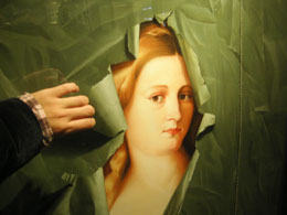 普通に鑑賞するのも驚きと興奮がありますが、このミュージアムのもう一つの魅力は写真撮影をしてかまわないというところです。その上写真撮影用の小道具まで用意してくれているので自分が絵の中に入ったようなからくり写真が撮影できるわけです。 たとえば……。